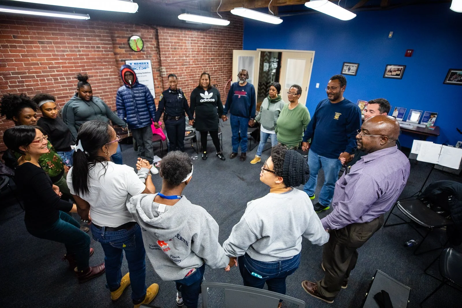 Code Listen was started by Shaw Pong as an inaugural City of Boston Artist-in-Residence in 2016. The initial residency included musical memorials to loved ones lost to homicide, music-dialogue workshops with police and youth (including youth in juvenile detention), research as an artist “embedded” in a local police station, and the formation of a music-dialogue ensemble of Boston police musicians and youth artists.