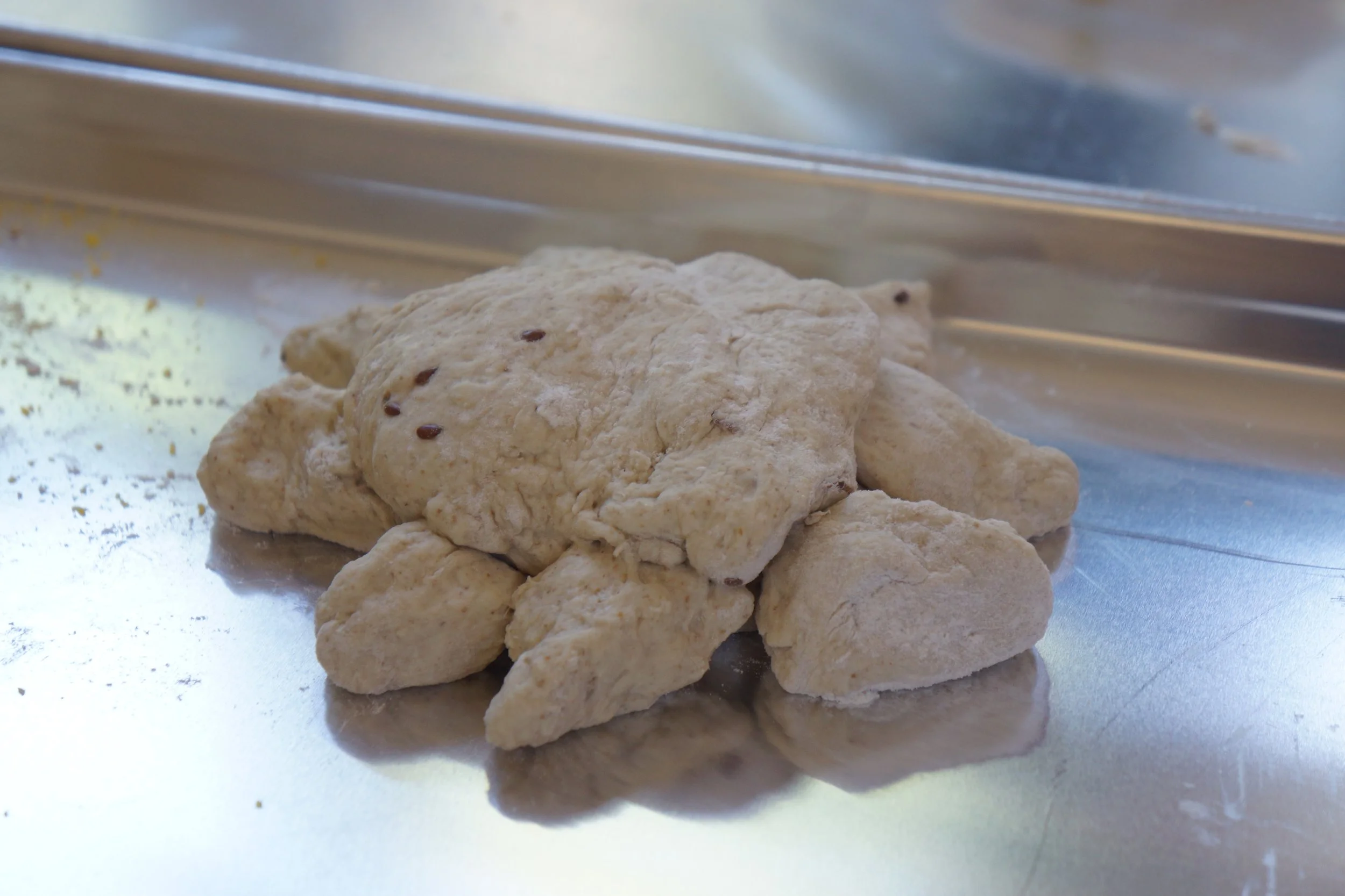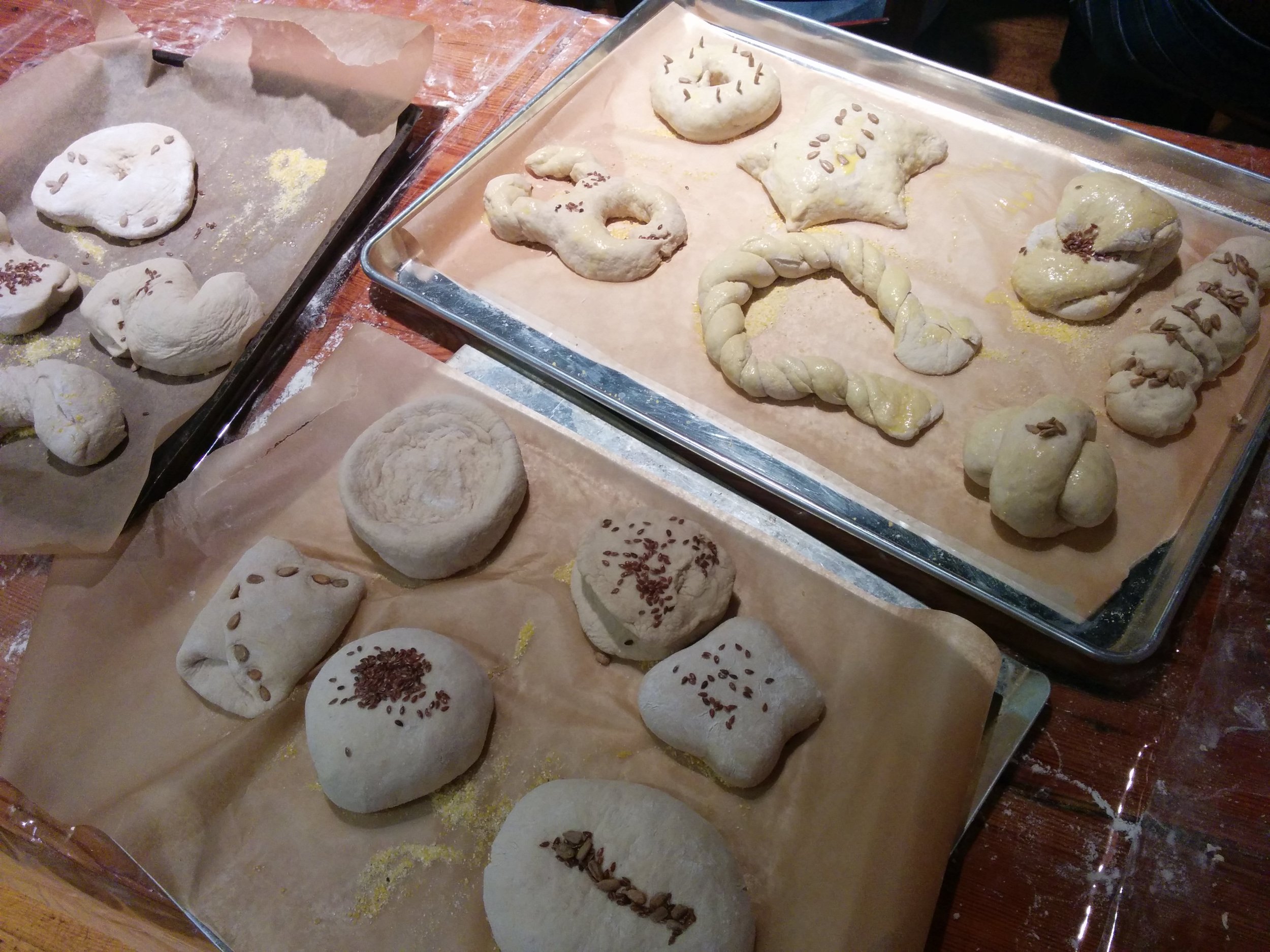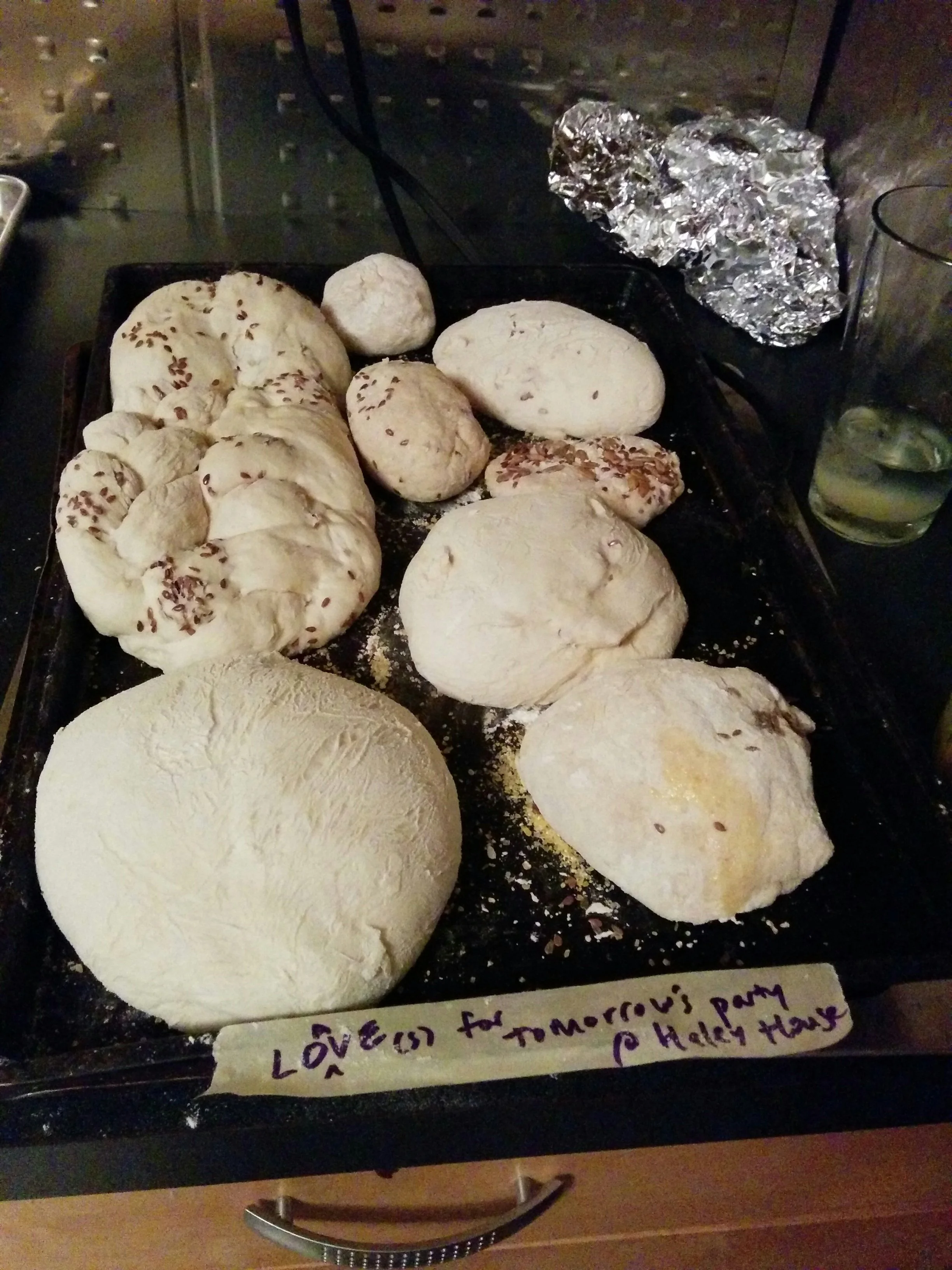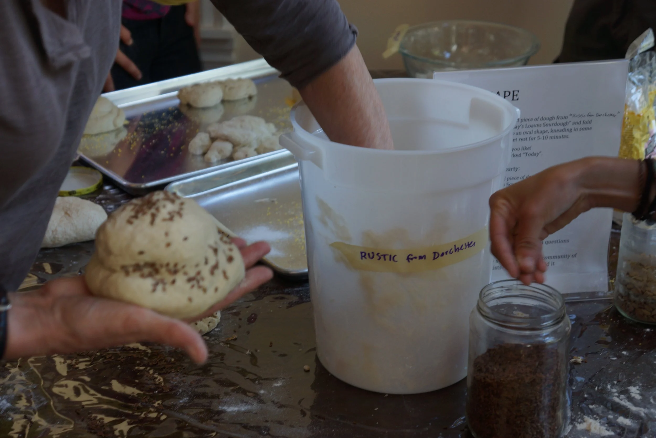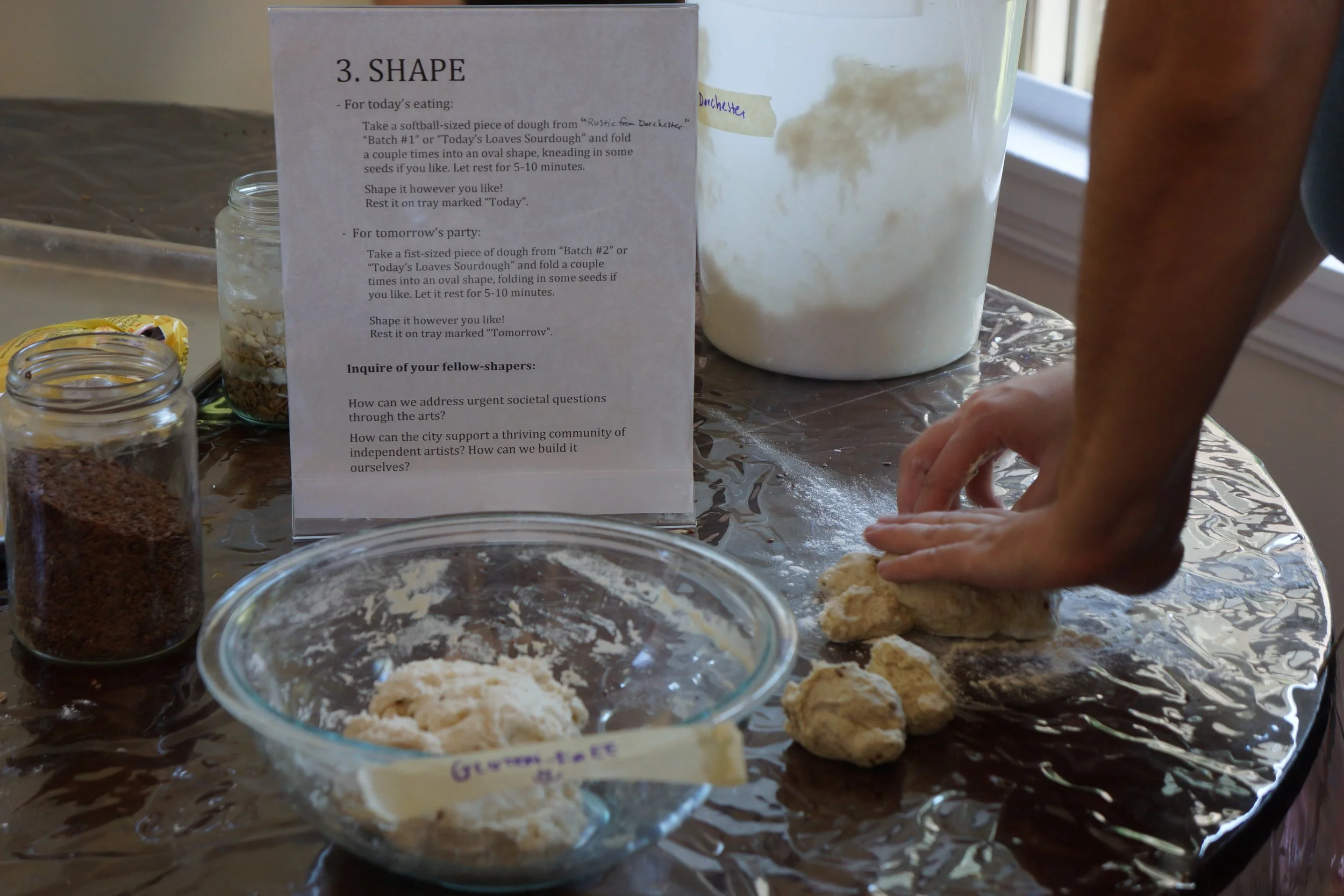 Dough mixed at previous party was shaped into loaves, with new dough mixed for the next day’s party, followed by dialogue about how the City of Boston could support artists’ needs