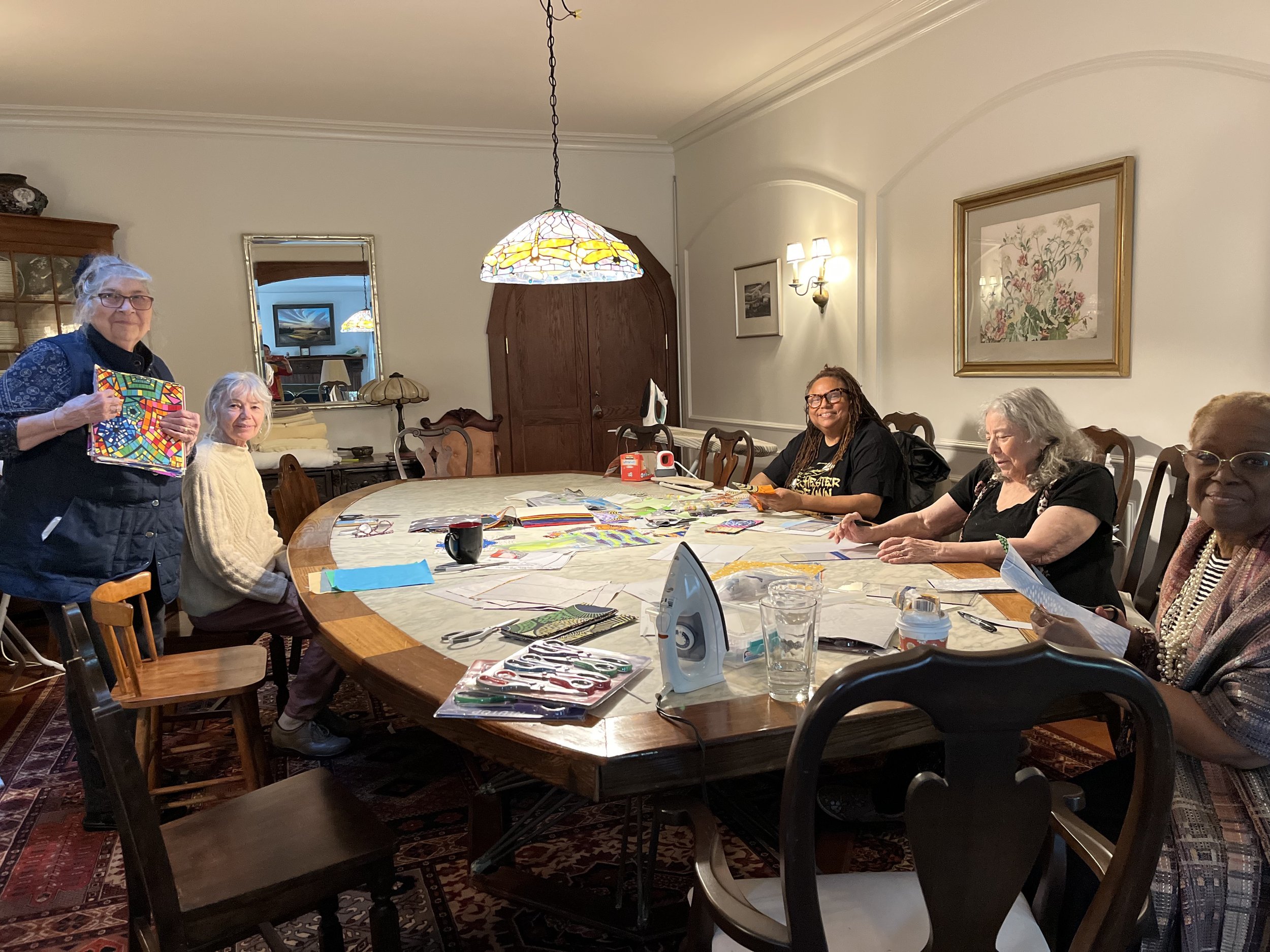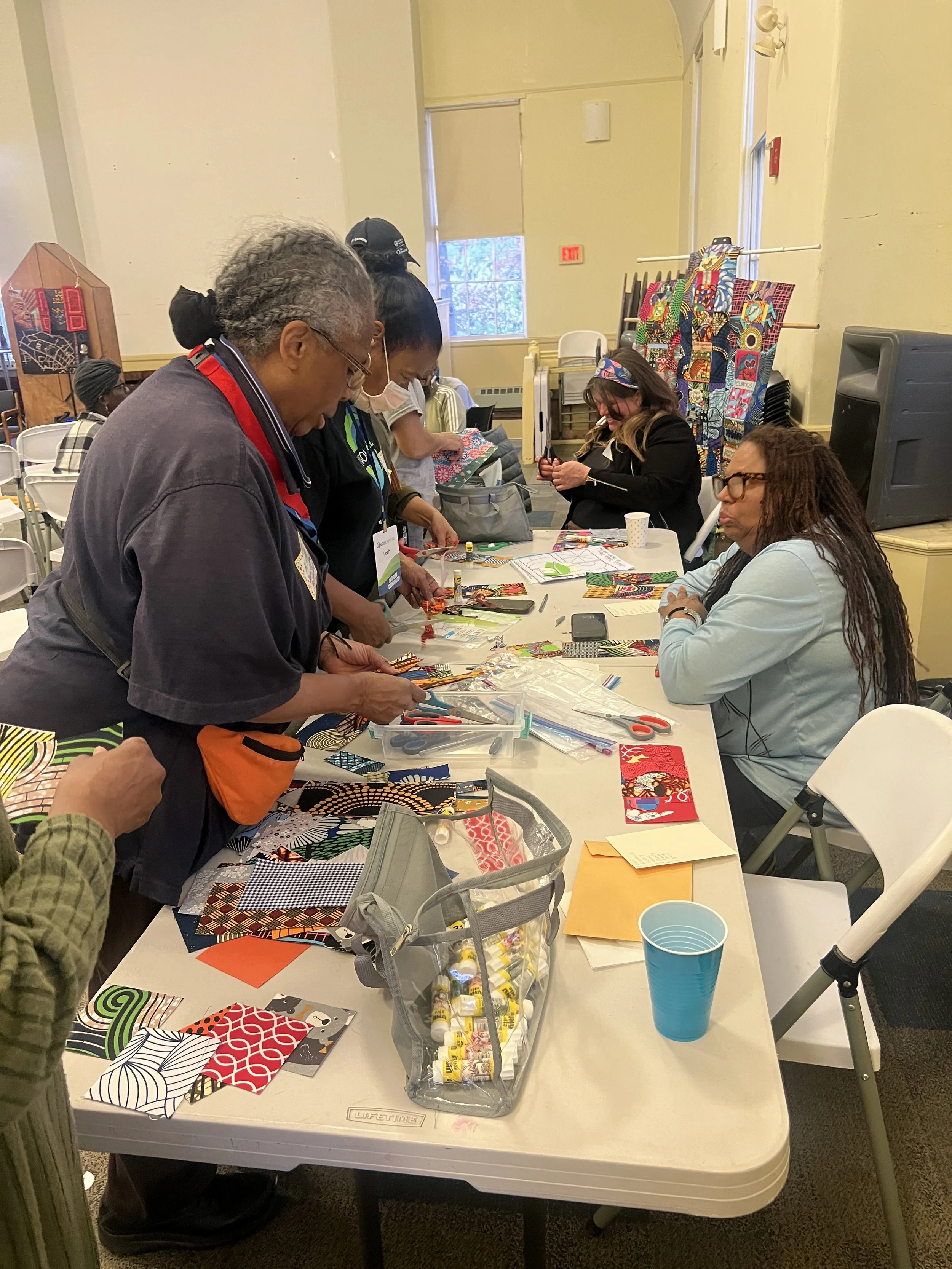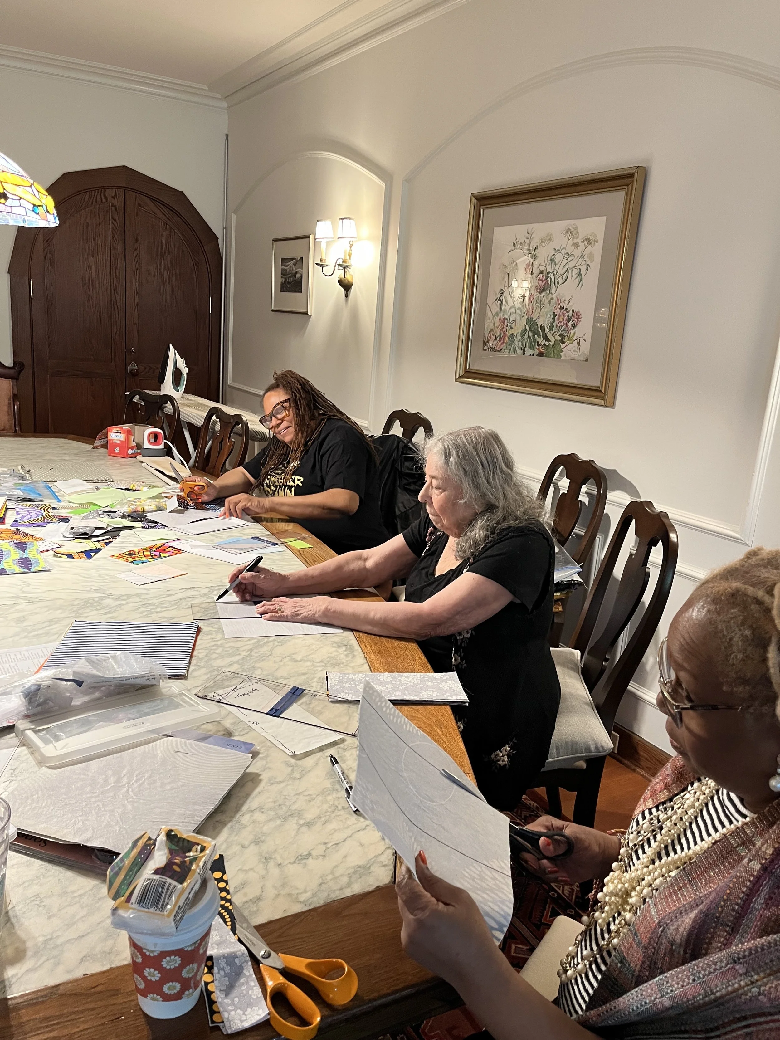 Volunteers helped cut, iron and create templates for upcoming neighborhood quilting events, April 2025
